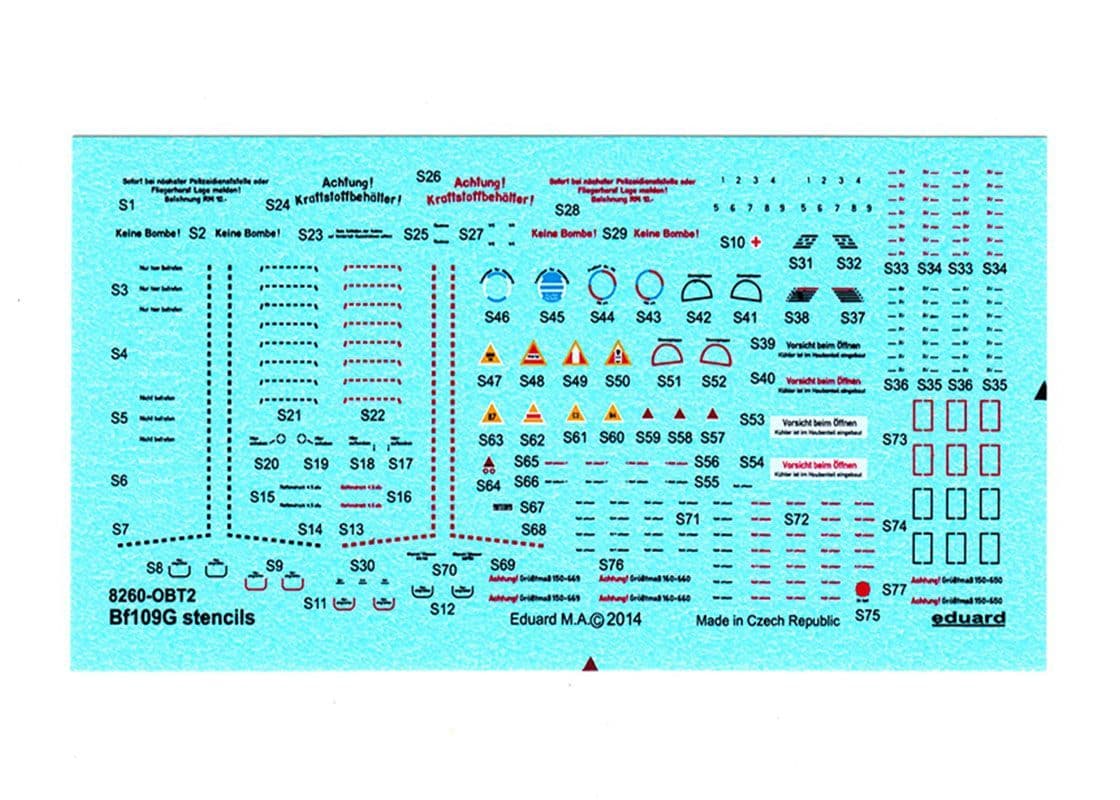 This sheet offers two complete sets of external stencils for the entire airframe, plus those for the drop tank. This sheet has been included in all the new Eduard kits, but these stencils should fit any Bf 109G-series kit in this scale.