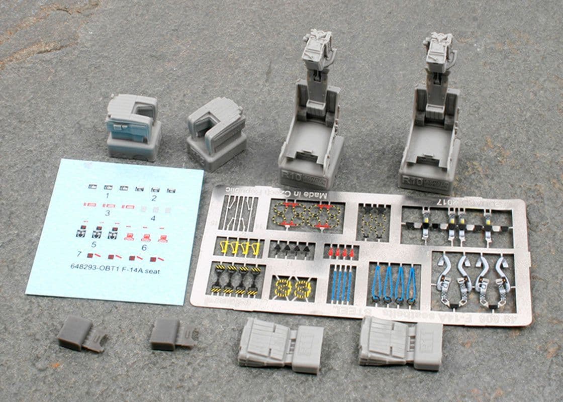 This pack contains two GRU-7 seats for the F-14A, with the seat and back cushions as separate parts and all the belts and firing handles as pre-painted photo-etched.
