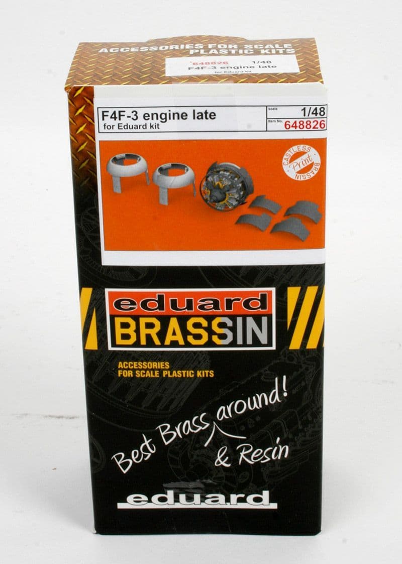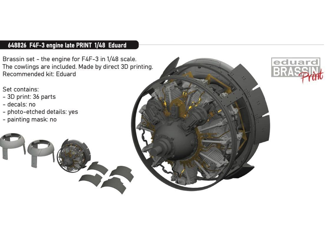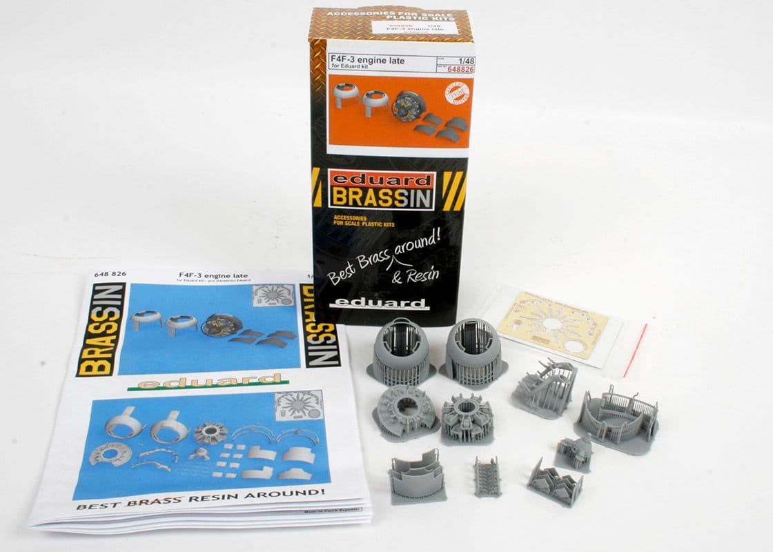 This boxed set offers highly detailed open gun bays for the new-tooled Wildcat kit from Eduard. There are twenty-one 3D-printed resin and five etched components. As the Eduard kit was deigned form the outset for sets like this, cutting will be minimal. In this late -3 version you have two types of front cowl ring, the one with the small air intake built under the top lip and intercooler intakes on either (lower) side, or the version with the external air intake at the top and intercoolers at the side. The rear of each cowl has three flaps at the top and one at the bottom, all of which are supplied separately here. The etched sprue includes the ignition harness, drive for the propeller governor and linkage at the rear of the engine. You will need to source wire of various diameters to create various pipework inside the cowls, but the air intakes are all shown full-length and there is detail inside the cowl elements, so this is a set designed for the advanced/experienced modeller.