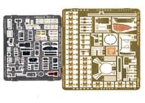 This is another two fret set, with one pre-painted and self-adhesive. Details include straps for the ammunition drums, rudder pedals, seat belts, fuel tank selector quadrant, various details above and below the floor section in the nose, Map case, oxygen mask container, various control units on each sidewall, the throttle/propeller control unit, the placards on the bulkhead, the framework in the fuselage below the dorsal gun position, ammunition drum rack, radio equipment, gear ring for the dorsal turret plus a new seat, ammunition drum and ring and bead sight. Also included are new instrument facias for the overhead console in the nose.
