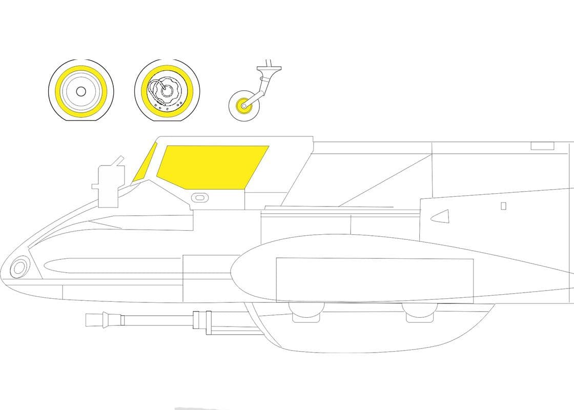 This set of die-cut, self-adhesive masks offers them for all the canopy glazing, both interior and exterior, as well as the main and tail wheel hubs.
