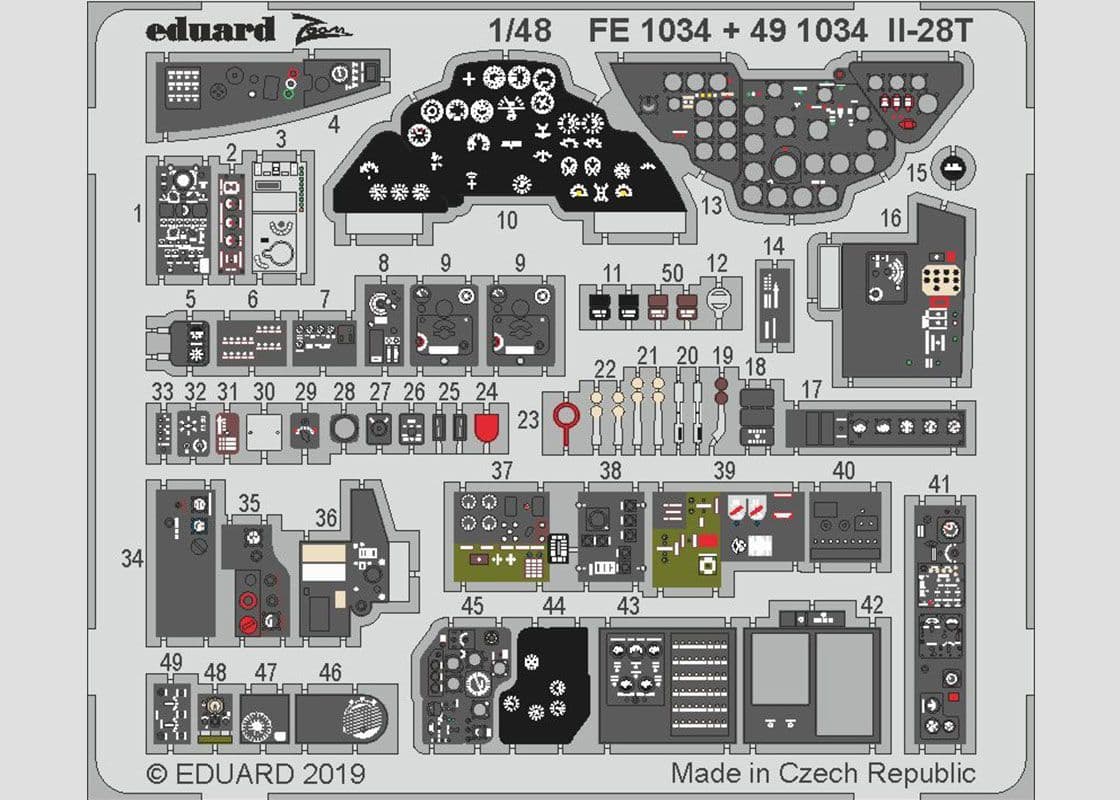 This is the pre-painted fret from #491034 and if offers various details for the sidewalls in the cockpit and nose, radar/radio equipment plus a new main instrument panel.