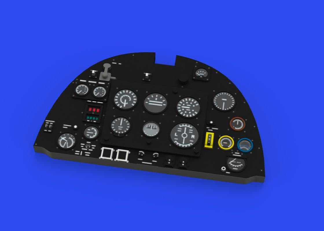 This set has a pre-painted resin main instrument panel plus pre-painted photo-etched seat belts, done using (thin) steel.