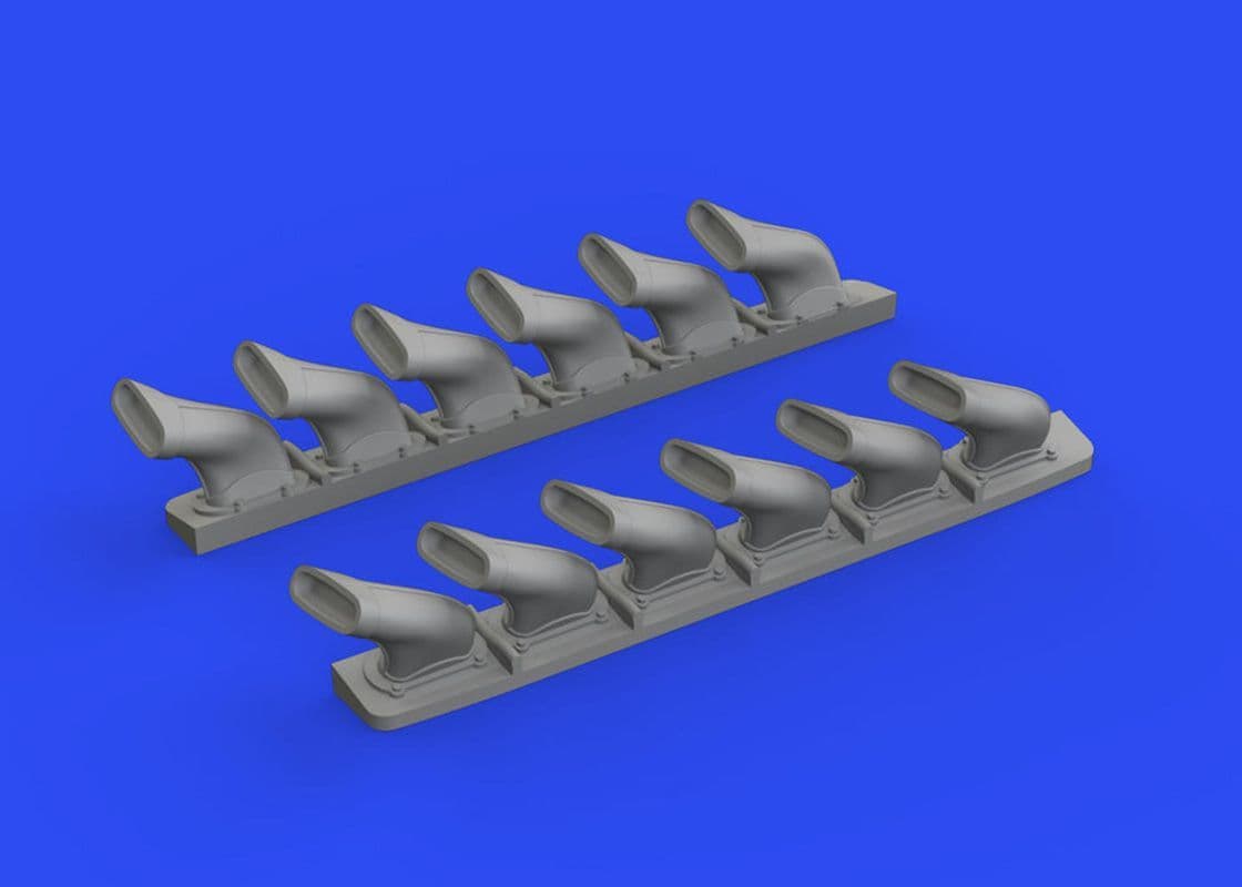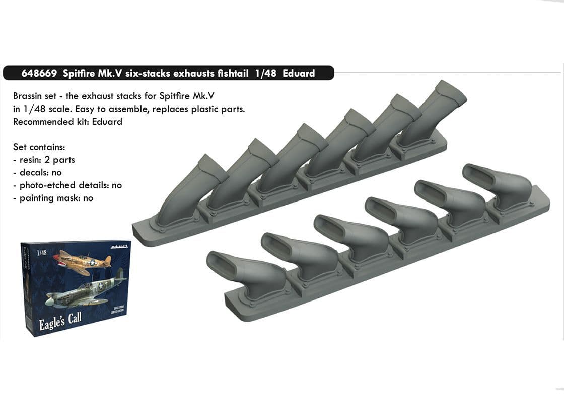 This pack contains highly detailed replacement exhausts for the Spitfire Mk V, with the outlet of each pipe slightly hollowed out.